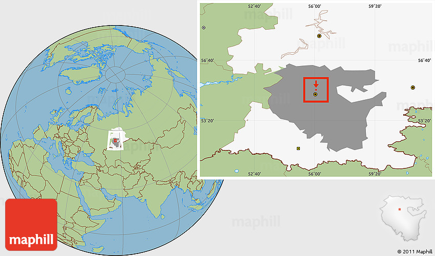The location map of Blagoveshchensk combines two projections: the orthographic azimuthal projection for the globe and the simple geographic projection for the rectangular part of the map. Geographic projection has straight meridians and parallels, each degree of latitude and longitude is the same size over the entire world map.