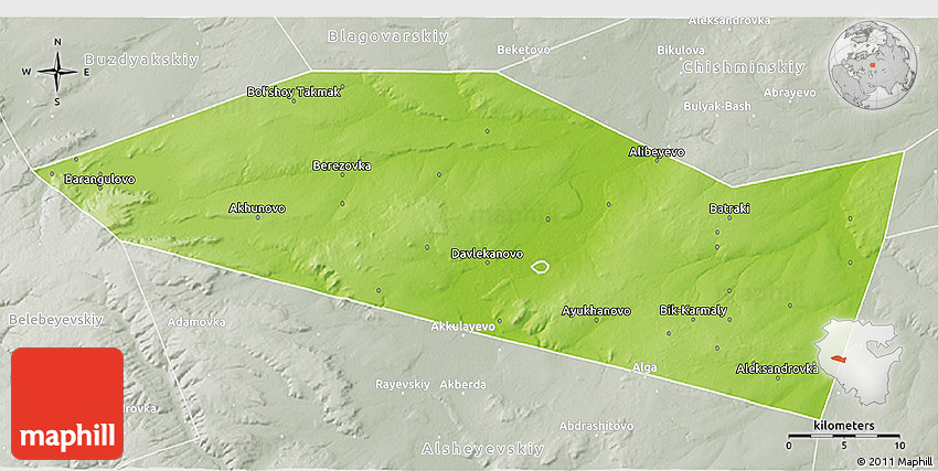 Physical map illustrates the mountains, lowlands, oceans, lakes and rivers and other physical landscape features of Davlekanovskiy. Differences in land elevations relative to the sea level are represented by color.