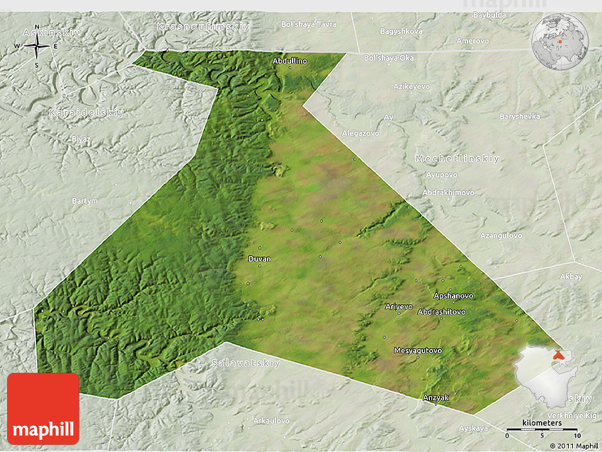 The 3D satellite map represents one of several map types available. Look at Duvanskiy, Bashkiria, Urals, Russia from different perspectives.