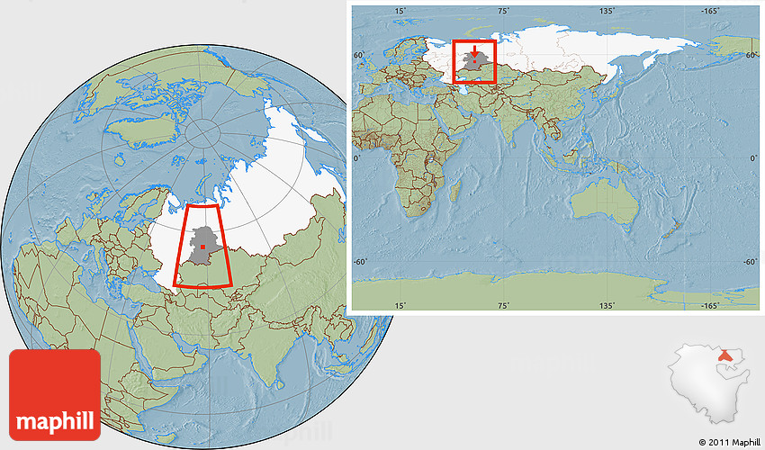 The location map of Duvanskiy combines two projections: the orthographic azimuthal projection for the globe and the simple geographic projection for the rectangular part of the map. Geographic projection has straight meridians and parallels, each degree of latitude and longitude is the same size over the entire world map.