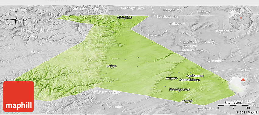 The panoramic physical map represents one of several map types available. Look at Duvanskiy, Bashkiria, Urals, Russia from different perspectives.