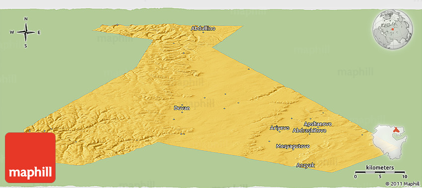 The panoramic savanna style map represents one of several map types available. Look at Duvanskiy, Bashkiria, Urals, Russia from different perspectives.