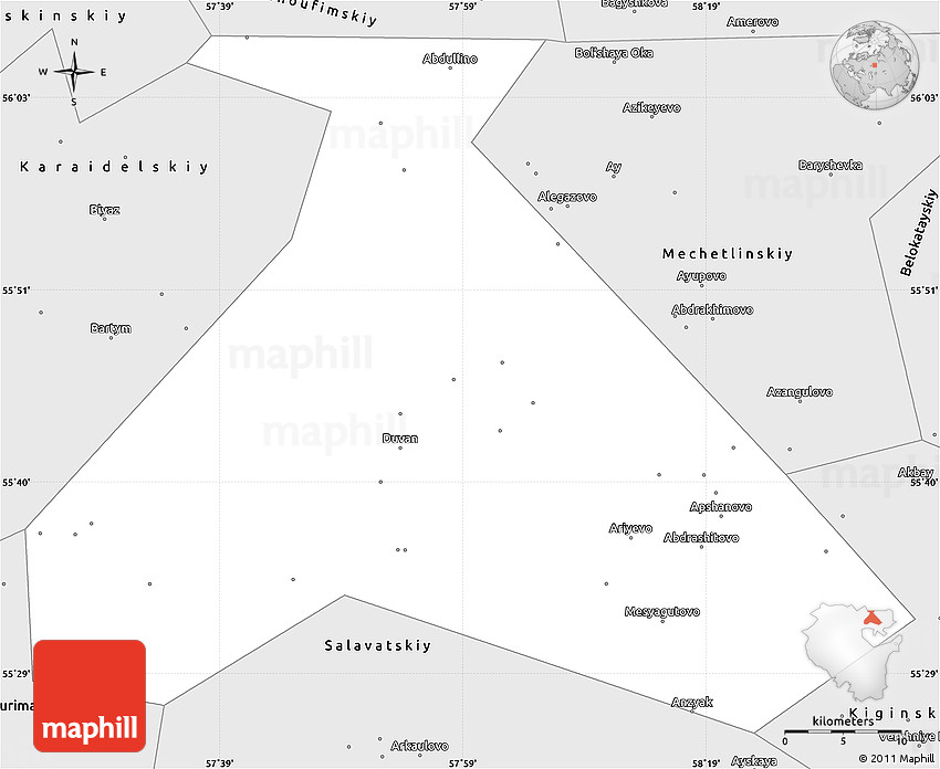 The silver style outline map represents one of several map types available. Look at Duvanskiy, Bashkiria, Urals, Russia from different perspectives.
