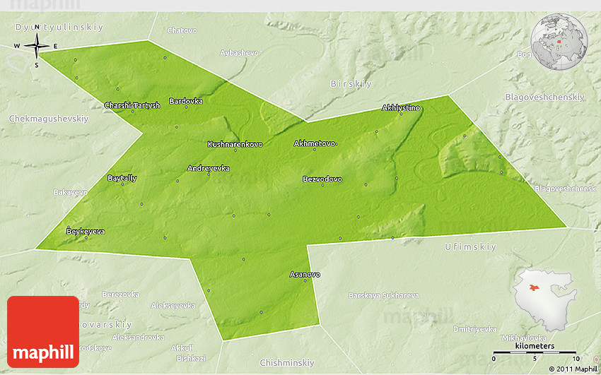The 3D physical map represents one of several map types available. Look at Kushnarenkovskiy, Bashkiria, Urals, Russia from different perspectives.