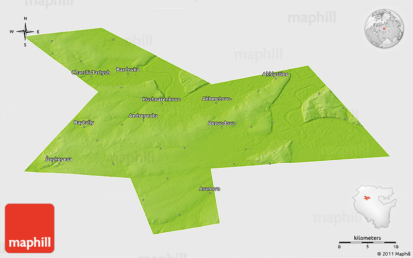 Physical map illustrates the mountains, lowlands, oceans, lakes and rivers and other physical landscape features of Kushnarenkovskiy. Differences in land elevations relative to the sea level are represented by color.