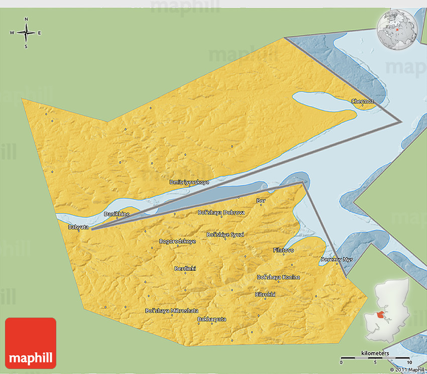 The 3D savanna style map represents one of several map types available. Look at Ilyinskiy, Perm Krai, Urals, Russia from different perspectives.