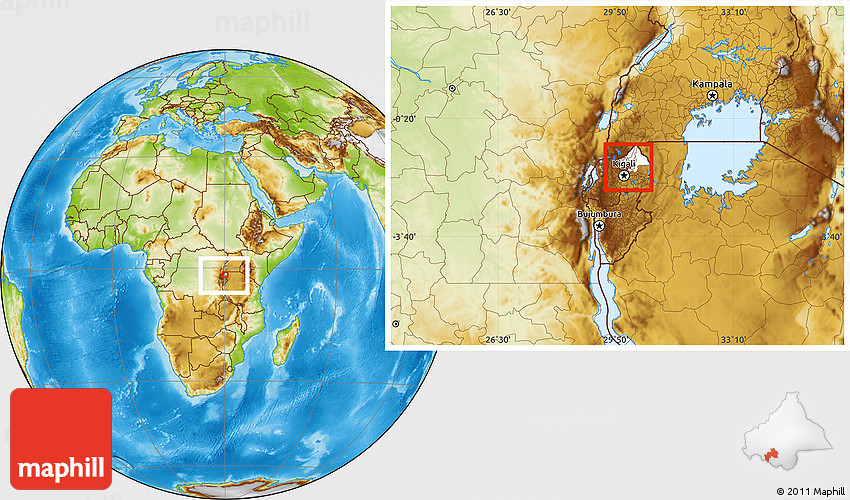 Maphill is a collection of map images. This image combines a physical map with the globe centered on Rutare. Use the buttons under the image to switch to different map types.