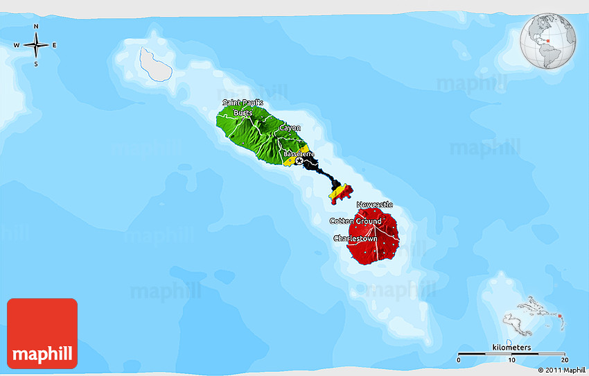 The 3D flag map represents one of many map types and styles available. Look at Saint Kitts and Nevis from different perspectives.