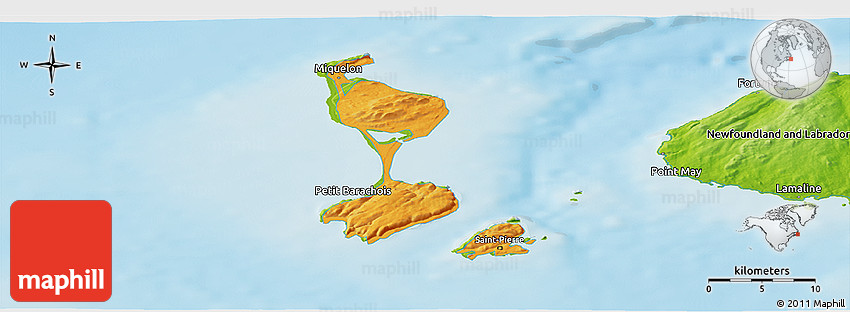 Physical map illustrates the mountains, lowlands, oceans, lakes and rivers and other physical landscape features of Saint Pierre and Miquelon. Differences in land elevations relative to the sea level are represented by color.