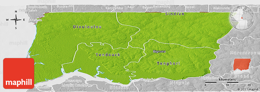 The panoramic physical map represents one of several map types and styles available. Look at Bignona, Ziguinchor, Senegal from different perspectives.