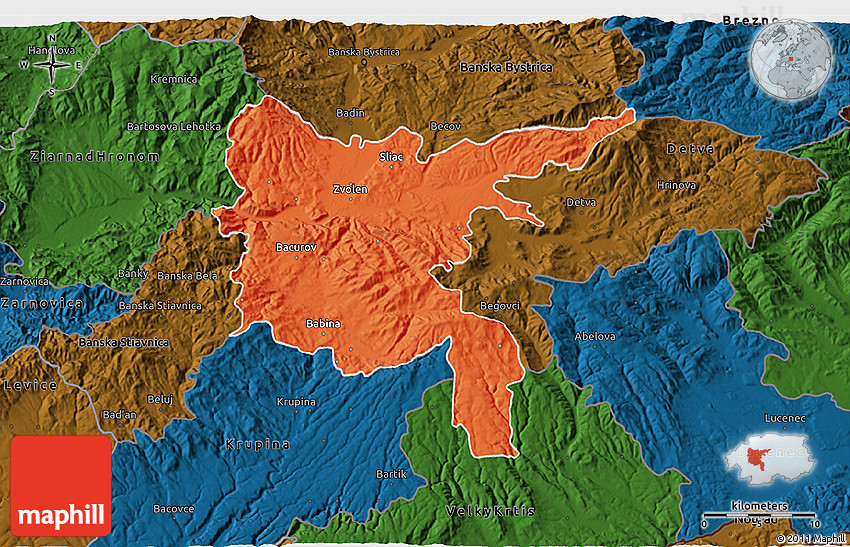 The 3D political map represents one of several map types and styles available. Look at Zvolen, Banska Bystrica, Slovakia from different perspectives.