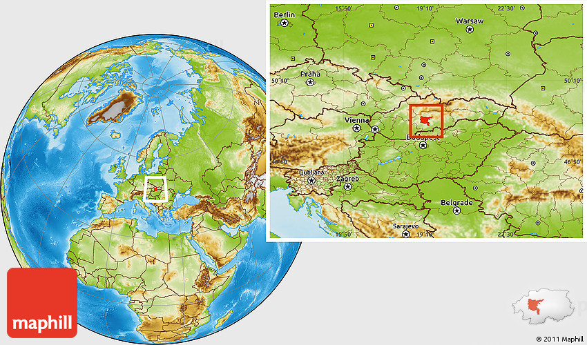 Maphill is a collection of map images. This image combines a physical map with the globe centered on Zvolen. Use the buttons under the image to switch to different map types.