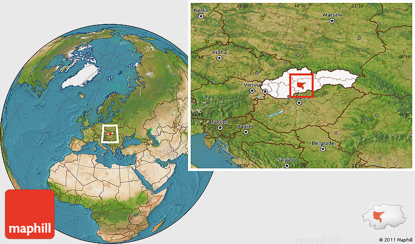 Maphill is a collection of map images. This image combines a satellite map with the globe centered on Zvolen. Use the buttons under the image to switch to different map types.