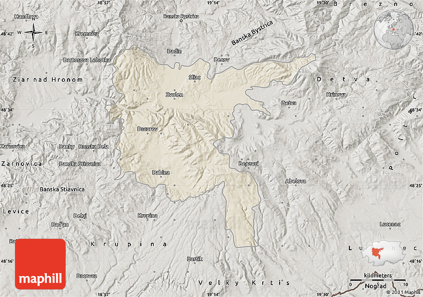 Shaded relief map shows landscape features, such as mountains, valleys and plateaus. Flat areas are smooth on the map, areas with steep slopes and mountains appear more rough. The above map of Zvolen was created using a digital elevation model.