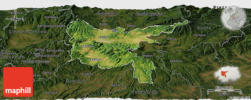 The panoramic satellite map represents one of several map types and styles available. Look at Zvolen, Banska Bystrica, Slovakia from different perspectives.
