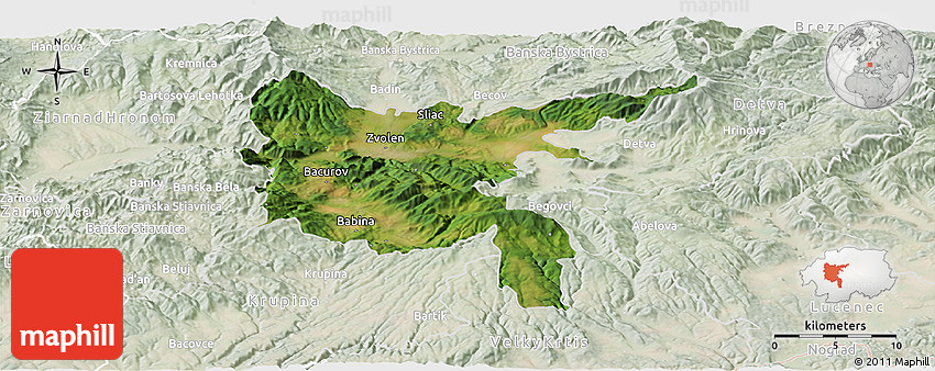 The panoramic satellite map represents one of several map types and styles available. Look at Zvolen, Banska Bystrica, Slovakia from different perspectives.