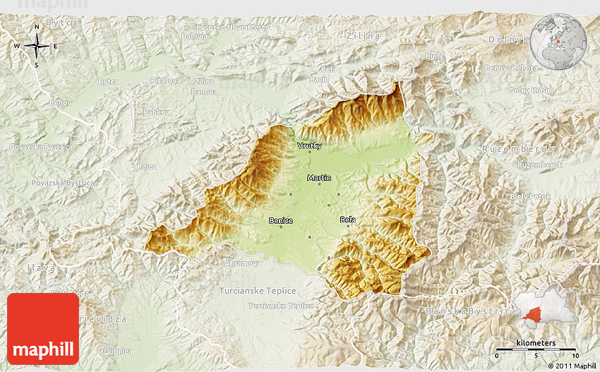 The 3D physical map represents one of several map types and styles available. Look at Martin, Zilina, Slovakia from different perspectives.