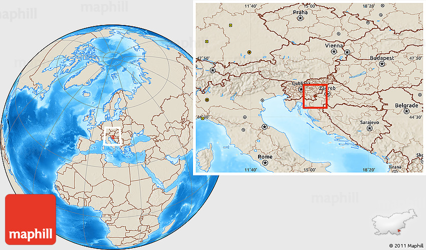 Maphill is a collection of map images. This image combines a shaded relief map with the globe centered on Metlika. Use the buttons under the image to switch to different map types.