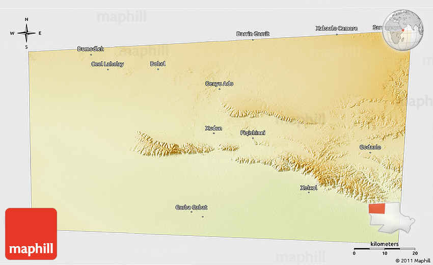 The 3D physical map represents one of several map types and styles available. Look at Xudun, Nugaal, Somalia from different perspectives.