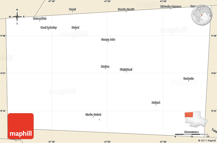The simple classic style outline map represents one of several map types and styles available. Look at Xudun, Nugaal, Somalia from different perspectives.