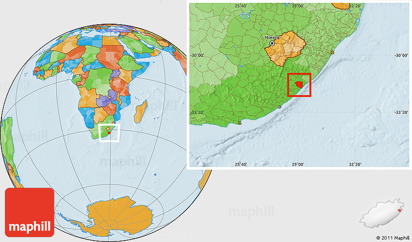 Maphill is a collection of map images. This image combines a political map with the globe centered on NGQELENI. Use the buttons under the image to switch to different map types.