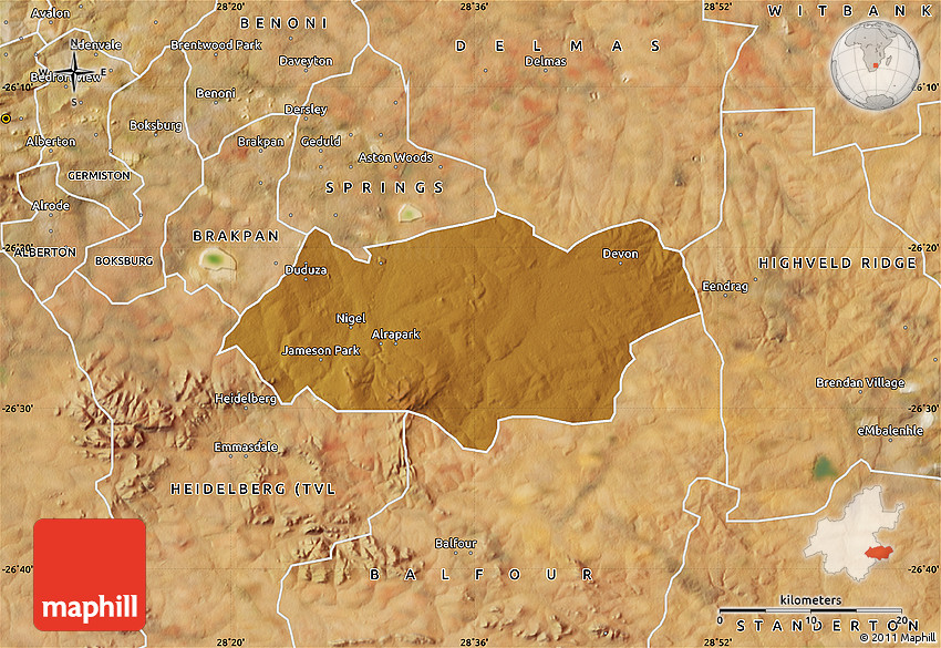 The flat physical map represents one of several map types and styles available. Look at NIGEL, Guateng, South Africa from different perspectives.