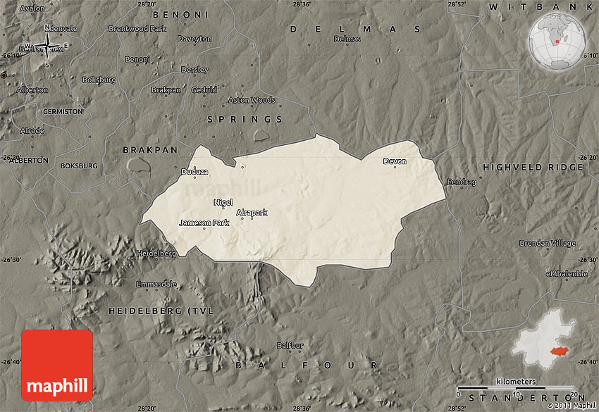 The flat shaded relief map represents one of several map types and styles available. Look at NIGEL, Guateng, South Africa from different perspectives.