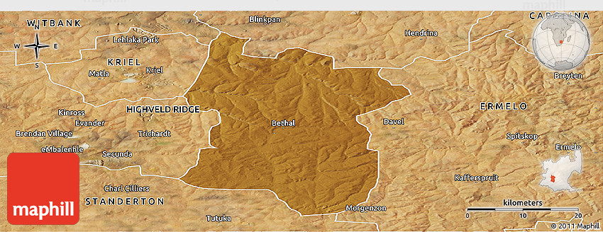 The panoramic physical map represents one of several map types and styles available. Look at BETHAL, Mpumalanga, South Africa from different perspectives.