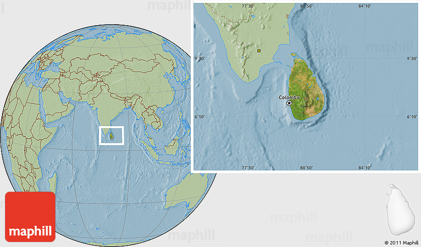 Maphill is a collection of map images. This image combines a satellite map with the globe centered on Sri Lanka. Use the buttons under the image to switch to different map types.