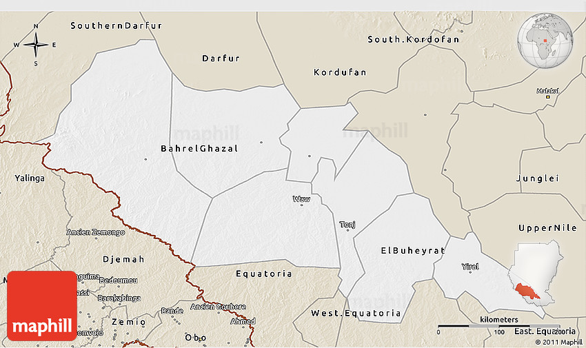 This map uses colors of vintage antique maps. Bahr el Ghazal is highlighted with white. The rest of the map is beige colored shaded relief map.