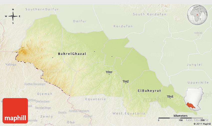 Physical map illustrates the mountains, lowlands, oceans, lakes and rivers and other physical landscape features of Bahr el Ghazal. Differences in land elevations relative to the sea level are represented by color.