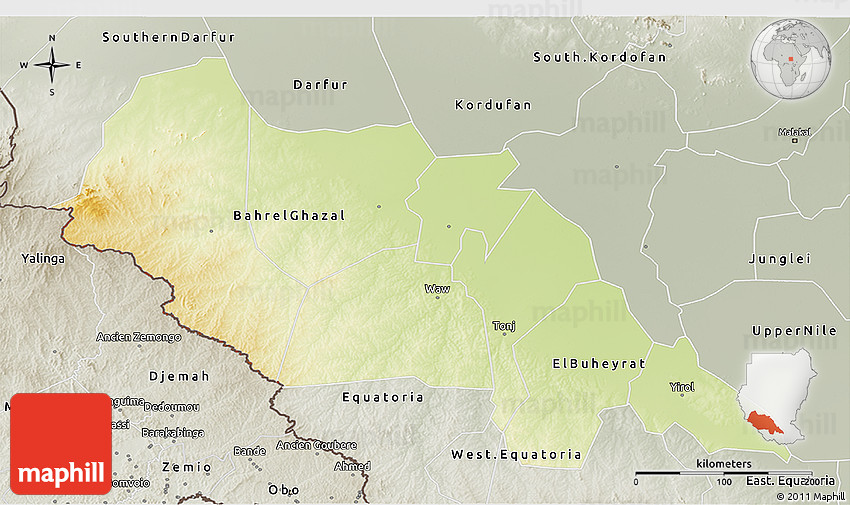 Physical map illustrates the mountains, lowlands, oceans, lakes and rivers and other physical landscape features of Bahr el Ghazal. Differences in land elevations relative to the sea level are represented by color.