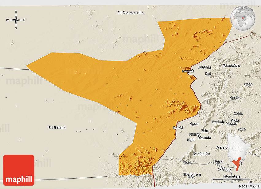 Each map type offers different information and each map style is designed for a different purpose. Read about the styles and map projection used in the above map (Political Panoramic Map of Kurmuk, shaded relief outside).