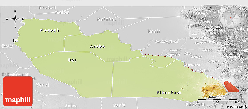 The panoramic physical map represents one of several map types and styles available. Look at Junglei, Upper Nile, Sudan from different perspectives.