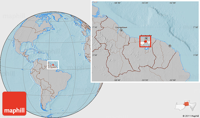 The gray location map represents one of several map types and styles available. Look at Zuid, Para, Suriname from different perspectives.