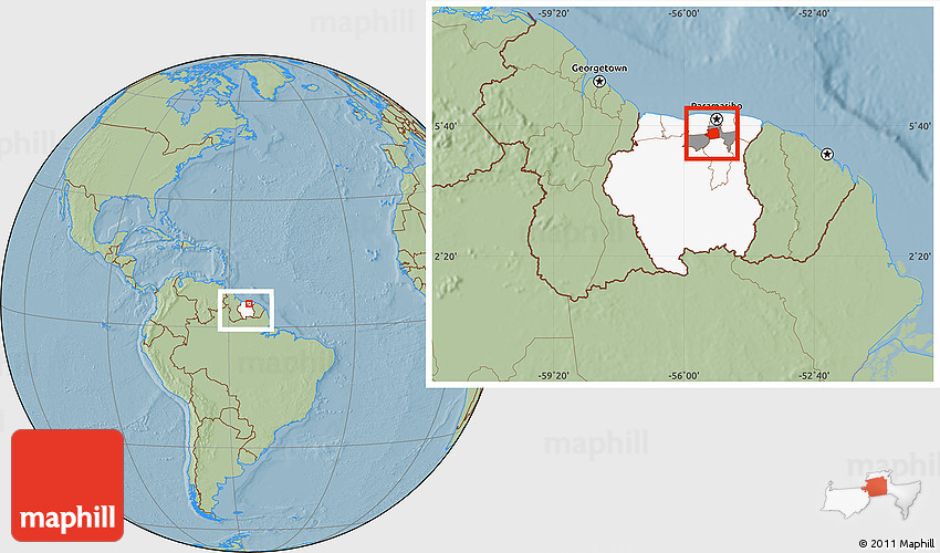 The savanna style location map represents one of several map types and styles available. Look at Zuid, Para, Suriname from different perspectives.
