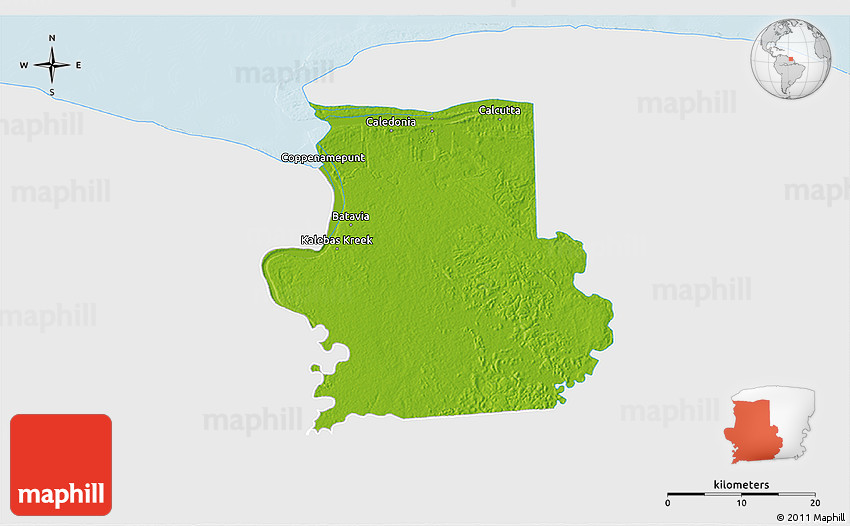 The 3D physical map represents one of several map types and styles available. Look at Calcutta, Saramacca, Suriname from different perspectives.