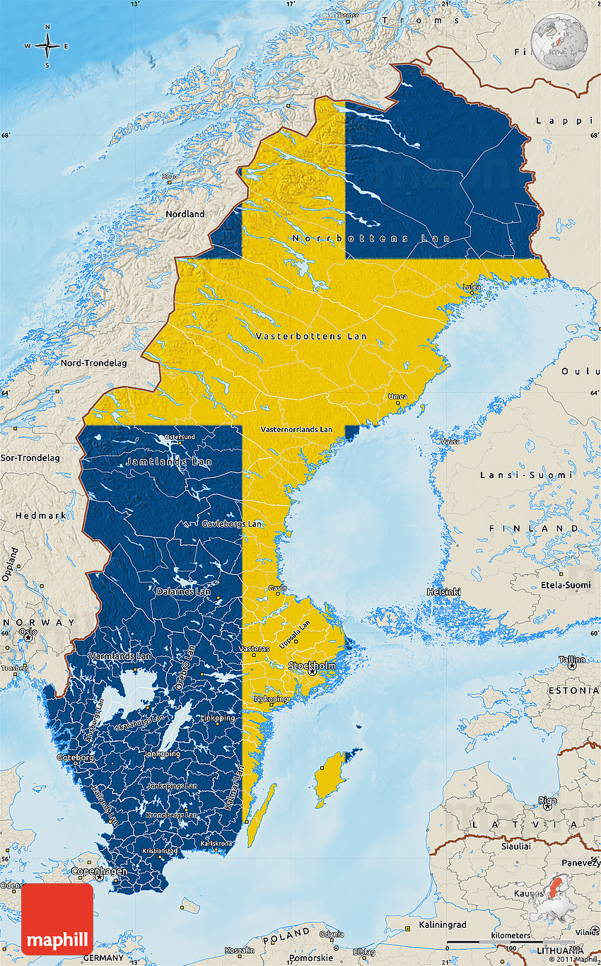 Maphill is a collection of map images. This flag map of Sweden is one of them. Click on the Detailed button under the image to switch to a more detailed map.