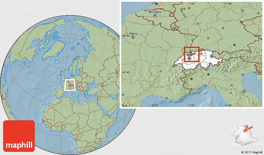 The location map of Solothurn combines two projections: the orthographic azimuthal projection for the globe and the simple geographic projection for the rectangular part of the map. Geographic projection has straight meridians and parallels, each degree of latitude and longitude is the same size over the entire world map.