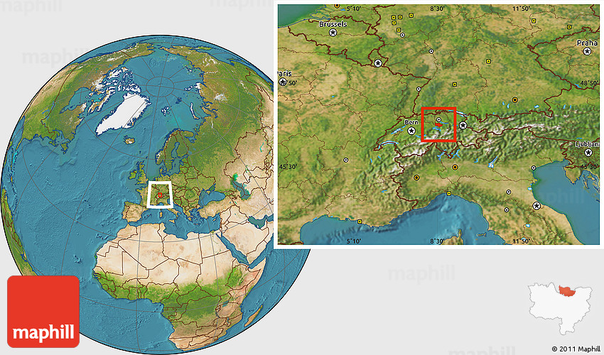 Maphill is a collection of map images. This image combines a satellite map with the globe centered on Zug. Use the buttons under the image to switch to different map types.