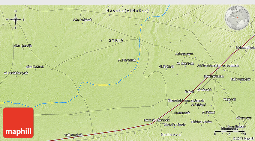 The 3D physical map represents one of many map types and styles available. Look at Bayāzah, Hasaka (Al Haksa), Syria from different perspectives.