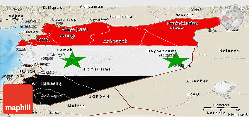 Flag map shows the flag of Syria clipped inside the country's borders. Flag image is resized to match the width and height of the country's outline. Maphill flag maps are more precise than often used flag clip art illustrations.