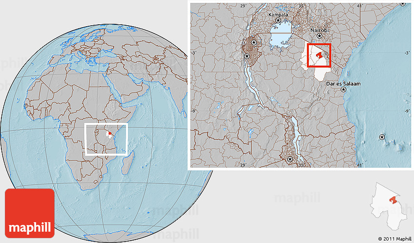 Maphill is a collection of map images. This image combines a gray map with the globe centered on Arumeru. Use the buttons under the image to switch to different map types.