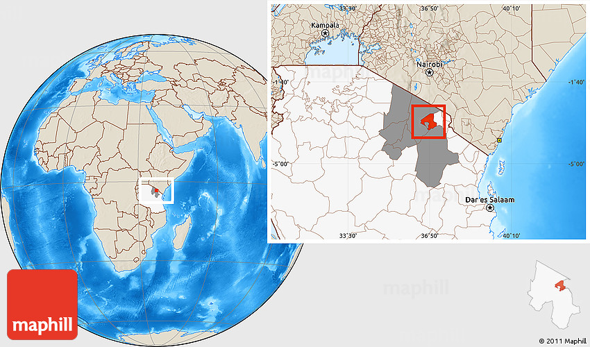 Maphill is a collection of map images. This image combines a shaded relief map with the globe centered on Arumeru. Use the buttons under the image to switch to different map types.