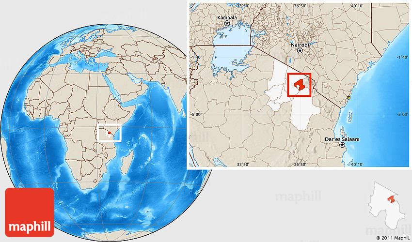 Maphill is a collection of map images. This image combines a shaded relief map with the globe centered on Arumeru. Use the buttons under the image to switch to different map types.