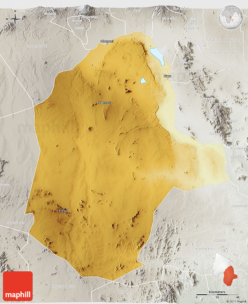 The 3D physical map represents one of several map types and styles available. Look at Kiteto, Arusha, Tanzania from different perspectives.