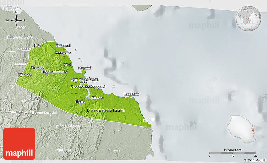 Physical map illustrates the mountains, lowlands, oceans, lakes and rivers and other physical landscape features of Dar-Es-Salaam. Differences in land elevations relative to the sea level are represented by color.