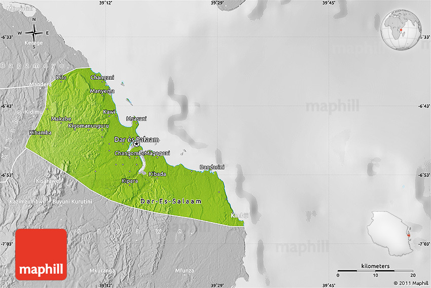 Each map type offers different information and each map style is designed for a different purpose. Read about the styles and map projection used in the above map (Physical Map of Dar-Es-Salaam, lighten, desaturated).