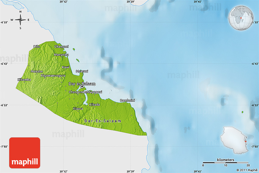 Physical map illustrates the mountains, lowlands, oceans, lakes and rivers and other physical landscape features of Dar-Es-Salaam. Differences in land elevations relative to the sea level are represented by color.