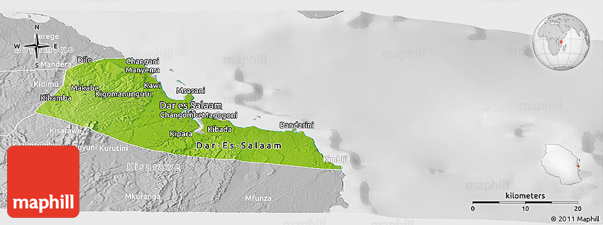 Each map type offers different information and each map style is designed for a different purpose. Read about the styles and map projection used in the above map (Physical Panoramic Map of Dar-Es-Salaam, lighten, desaturated).